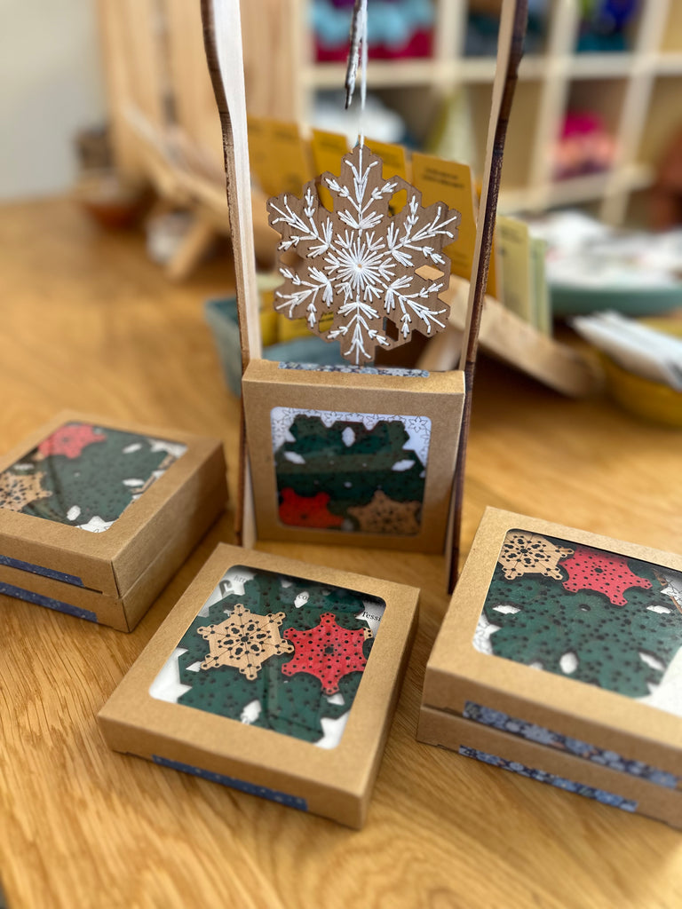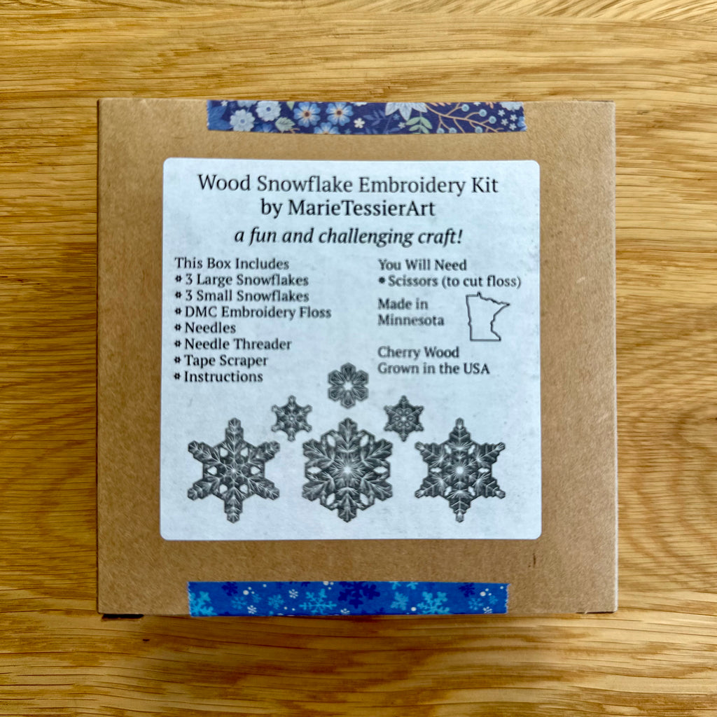 Embroider your own wooden snowflake ornaments with this kit made in Grand Marais.