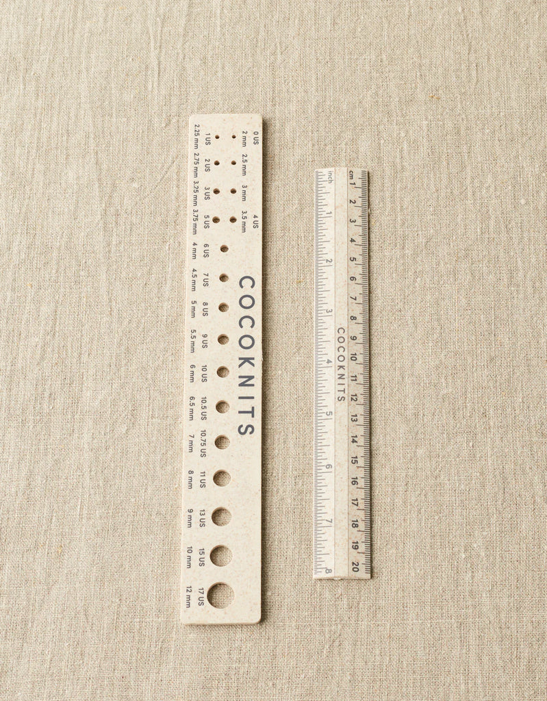 Designed to be used with our Maker’s Board, the handy Ruler and Gauge are also useful on their own. Magnets are embedded (without glue) in the back of each tool so they attach to the Maker’s Board, or any metal surface. In addition to measuring and checking knitting needle sizes, these tools can be used as straight edges on the Maker’s Board to help track patterns and charts. Plastic free, they are made of PLA (plant fiber, 100% biodegradable plant fiber, not water soluble) in a charming speckled linen color.